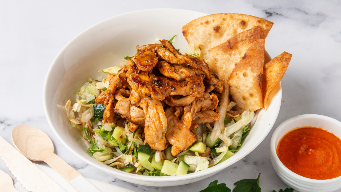 Chicken Shawarma Salad Limited Time Special ends 30th Nov, served on a bed of freshly made Fattoush salad & drizzled with our homemade & preservative-free mild harissa sauce